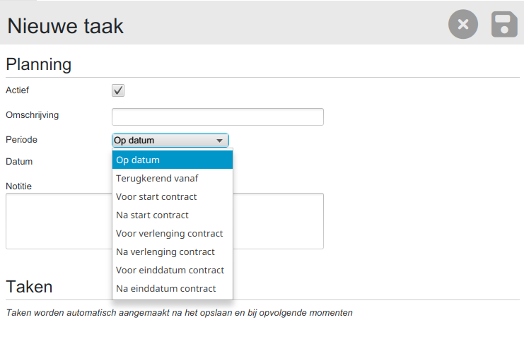 De kracht van het contractmanagement systeem is dat voor ieder contract taken kunnen worden ingepland. Dit zijn acties die moeten worden uitgevoerd op een vooraf gedefinieerd moment. Hierbij kan je bijvoorbeeld denken aan het vooraf polsen of alles goed gaat. Controle tijdens de loop van het contract. Of evaluatie na afloop van een contract.